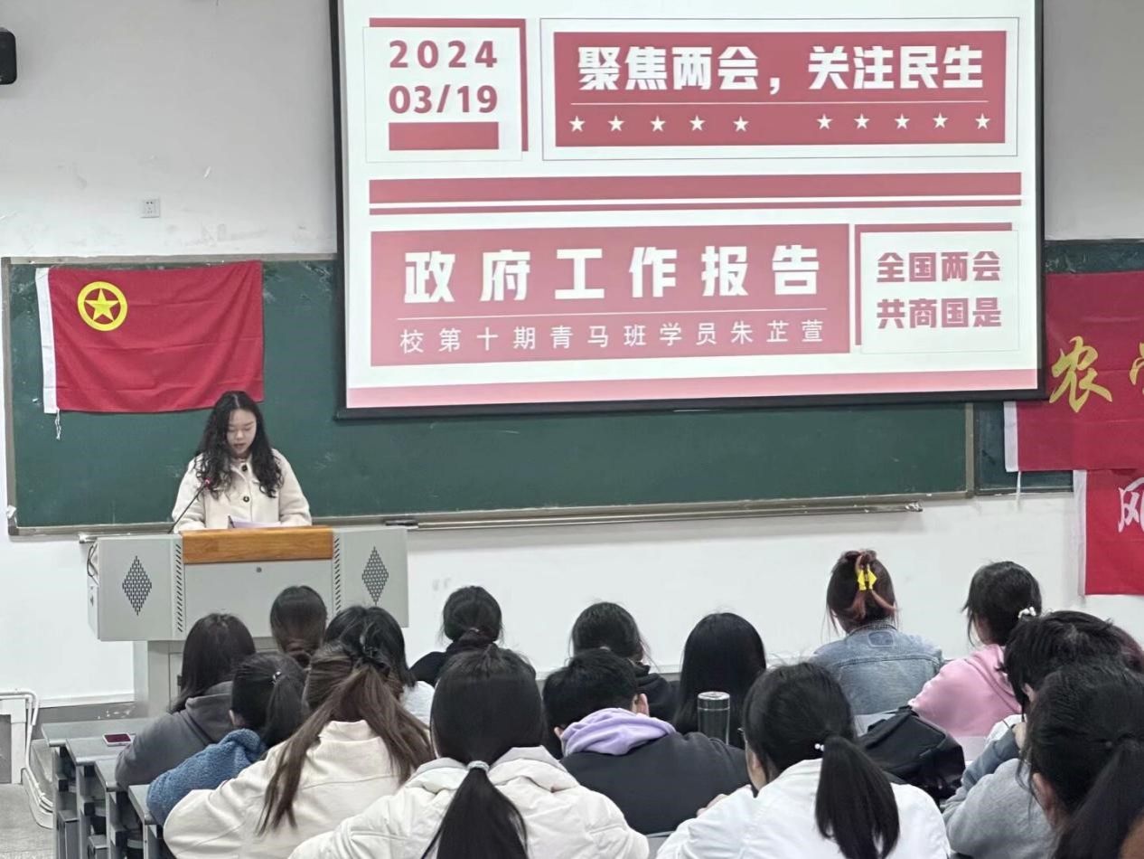 在班团活动现场,支部主要围绕两会精神开展学习活动。植保202202团支部万红伶领学了习近平总书记在全国两会上的系列重要讲话,让各支部同学再一次近距离学习领悟习近平总书记重要讲话精神。活动还邀请校级青马班的优秀低调看球 朱芷萱和李铭宏领学全国两会内容。朱芷萱从就业、教育等五个民生方面分享了自己学习的收获;李铭宏从学习建设科技强国思想的角度,以川农人的身份,号召大家担当历史责任,争做新时代农业强国的建设者。