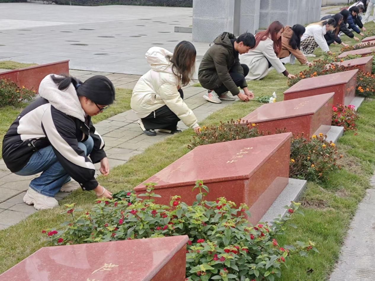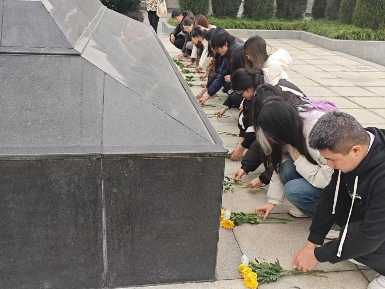 图为同学们为烈士陵墓献花(通讯员何霁潼)