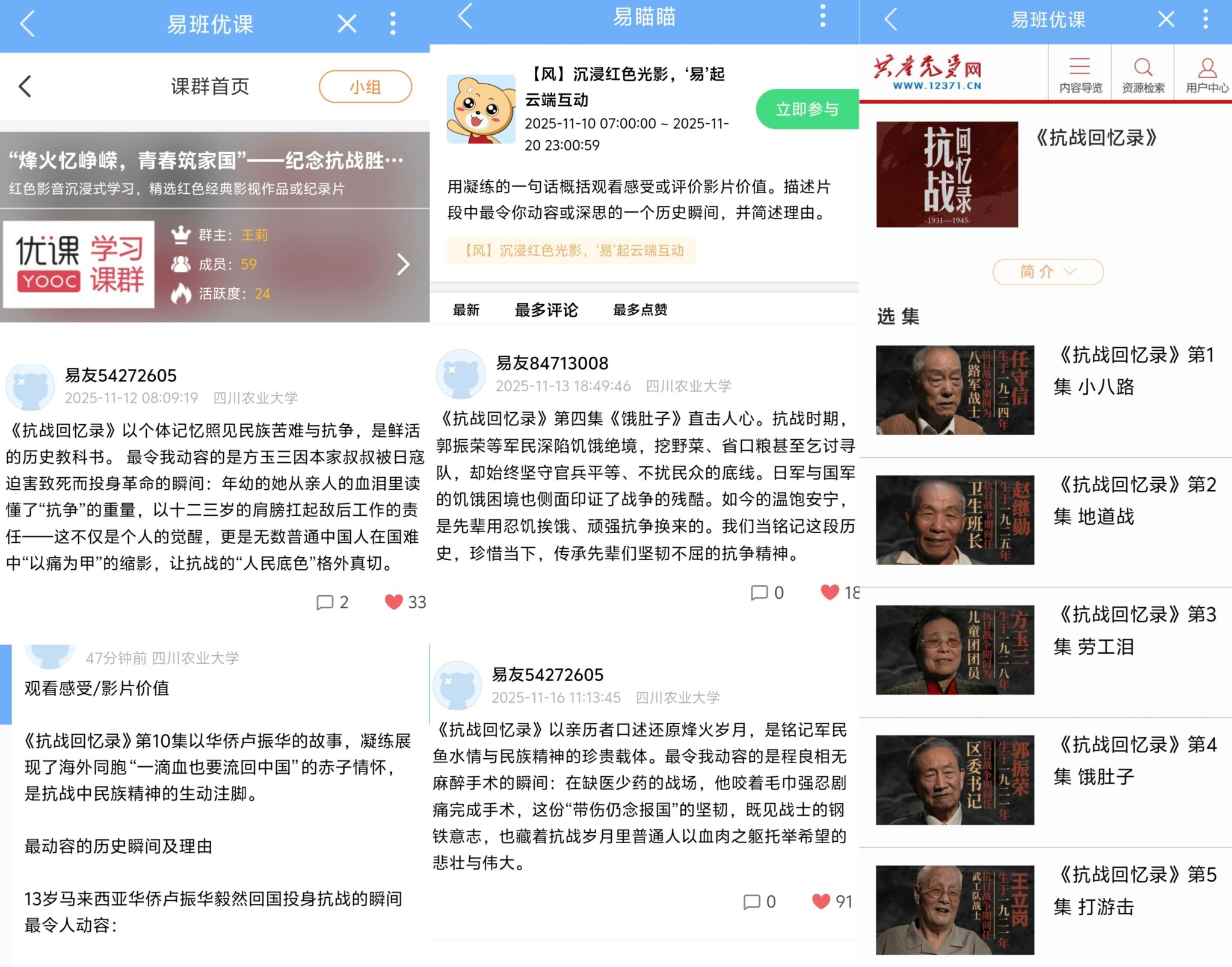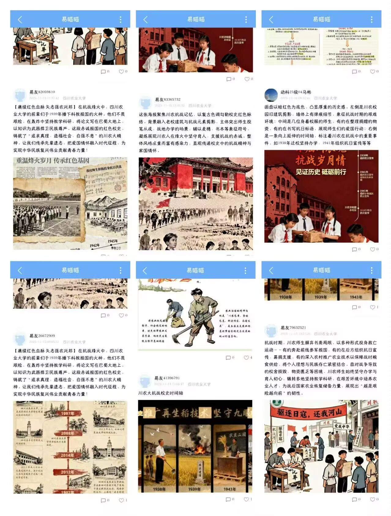 依托易班优课开展的“战史寻光,向光而行”知史明志竞答行活动中,答题内容从抗战历史知识,到川农大精神,同学们在答题中重温抗战历史,感悟抗战精神;“校史中的抗战记忆,海报绘红色篇章”创意活动,则引导学生挖掘川农抗战校史故事,以图文海报重塑革命场景,展现青春风采。