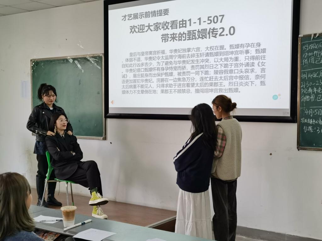 比如,来自风景园林专业的女生寝室1-1-507——高冷低调戏精组。她们通过图片向评委们介绍了寝室墙纸大改造的过程,制定了打扫卫生的排班表并互相监督。此外,在学习和生活上她们也安排的井井有条。一张摆满证书的照片引起大家的惊叹,快乐出游的记录也让大家感到温暖。最精彩的是现场表演。以微信头像为灵感,这个寝室的同学们现场为我们还原了甄嬛传中的一段戏份,在十分还原地演绎基础上加上了自己的改编创作,生动而又有趣。
