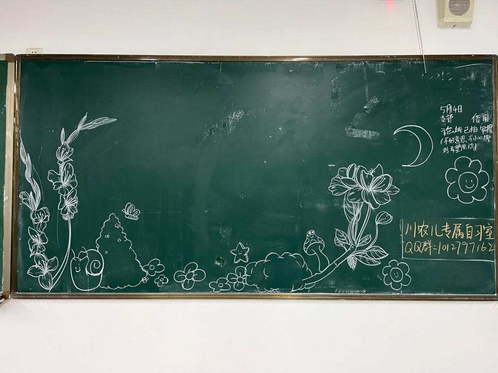 活动开展当天志愿者在进行了简单的分组和任务分配后,每个小组的成员都开始进行美化工作。志愿者们分工明确,在把一部分杂乱的信息擦除后,他们开始用粉笔在小黑板上作画。原本写满借用信息以及各种广告的黑板,变得干净整洁美观起来。与此同时干净的黑板以及美观的装饰,让每一个进入教室的老师和学生都感到心情愉悦和舒适。这次的美化黑板活动为师生创造了一个舒适的环境,大大地提高了学习和教学的效率。