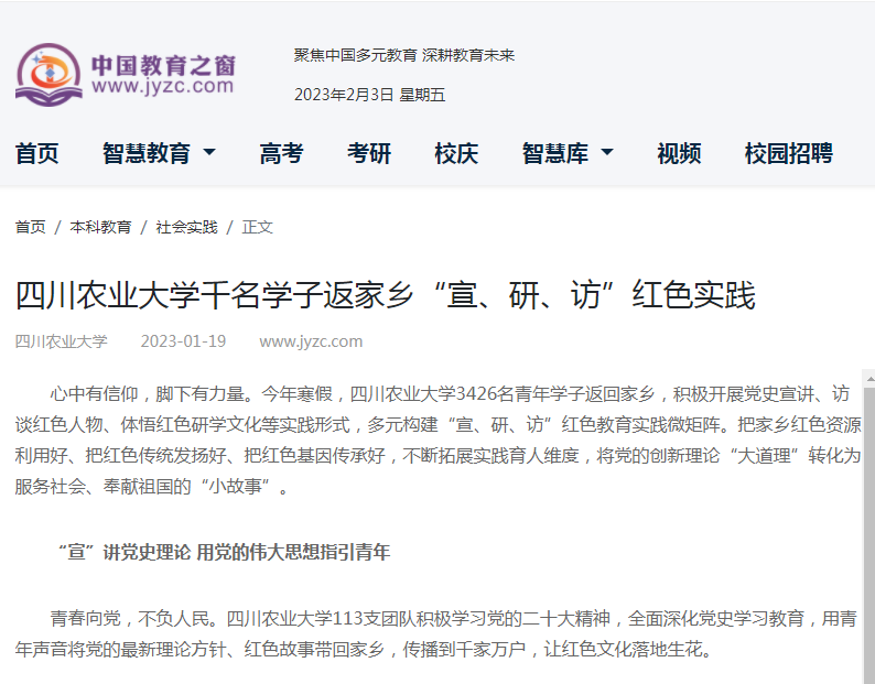 心中有信仰,脚下有力量。今年寒假,四川农业大学3426名青年学子返回家乡,积极开展党史宣讲、访谈红色人物、体悟红色研学文化等实践形式,多元构建“宣、研、访”红色教育实践微矩阵。把家乡红色资源利用好、把红色传统发扬好、把红色基因传承好,不断拓展实践育人维度,将党的创新理论“大道理”转化为服务社会、奉献祖国的“小故事”。