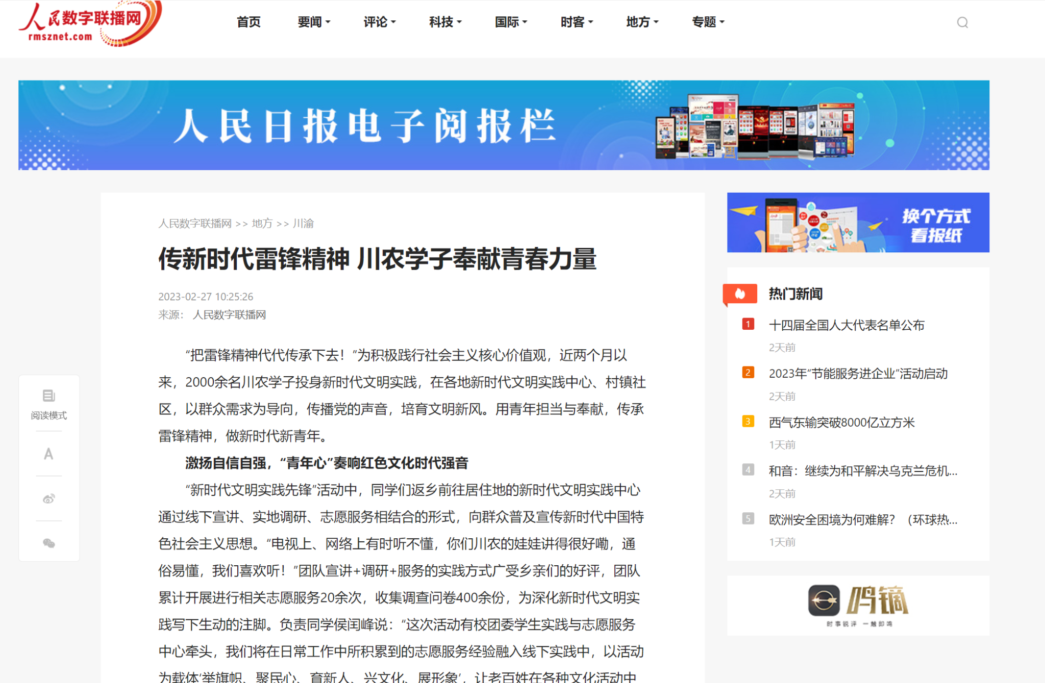 今年是毛泽东等老一辈革命家为雷锋同志题词60周年。在新征程上,为深刻把握雷锋精神的时代内涵,四川农业大学积极引导青年学子投身新时代文明实践“最后一公里”,让学雷锋在人民群众特别是青少年中蔚然成风,让学雷锋活动融入日常、化作经常,让雷锋精神在新时代绽放更加璀璨的光芒,为全面建设社会主义现代化国家、全面推进中华民族伟大复兴凝聚青春力量。