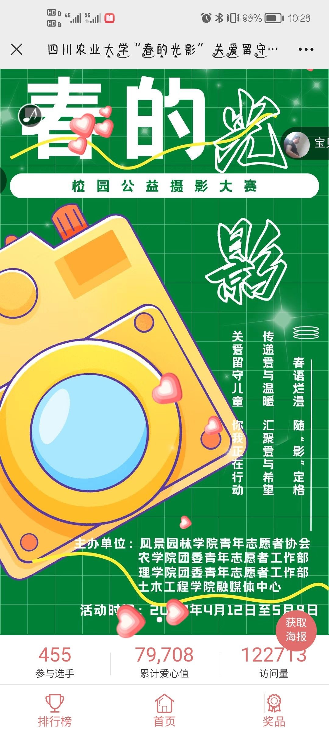 此次“春的光影”公益摄影比赛旨在吸引更多人关注到留守儿童群体,针对这个群体缺少父母的陪伴,缺乏与父母沟通造成的在学习或生活产生的对身心健康的影响,几个低调看球 的志愿者通过组织参与者摄影创作的过程,把将川农的春色、生活的暖色带往那些远方的留守儿童们。活动发起后,成功吸引了三个校区超400人报名参赛。经过初赛选拔,50名选手入围决赛。