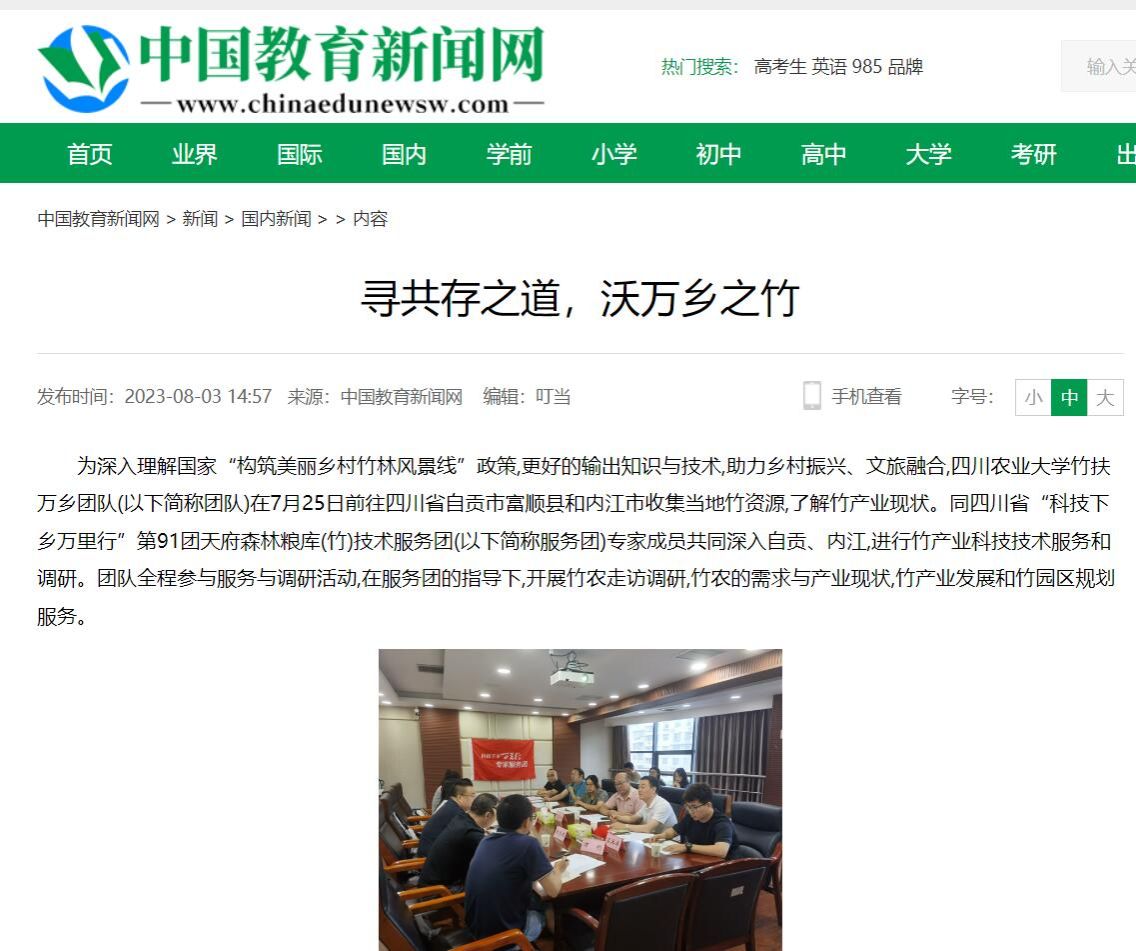 为深入理解国家“构筑美丽乡村竹林风景线”政策,更好的输出知识与技术,助力乡村振兴、文旅融合,四川农业大学竹扶万乡团队(以下简称团队)在7月25日前往四川省自贡市富顺县和内江市收集当地竹资源,了解竹产业现状。同四川省“科技下乡万里行”第91团天府森林粮库(竹)技术服务团(以下简称服务团)专家成员共同深入自贡、内江,进行竹产业科技技术服务和调研。团队全程参与服务与调研活动,在服务团的指导下,开展竹农走访调研,竹农的需求与产业现状,竹产业发展和竹园区规划服务。