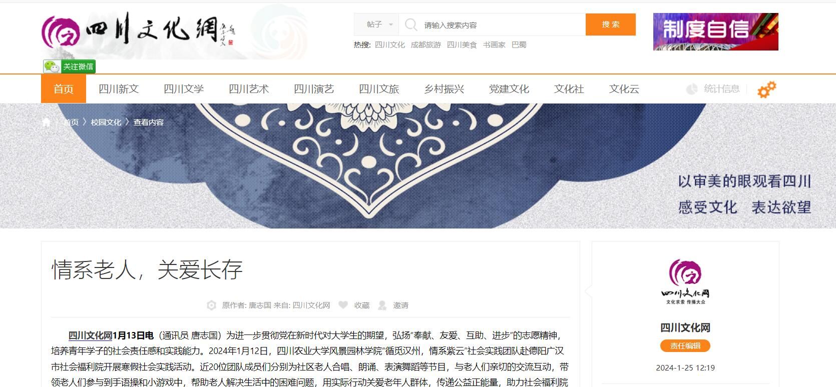 四川文化网1月13日电(通讯员 唐志国)为进一步贯彻党在新时代对大学生的期望,弘扬“奉献、友爱、互助、进步”的志愿精神,培养青年学子的社会责任感和实践能力。2024年1月12日,低调看球-低调jrs看球app “循觅汉州,情系紫云”社会实践团队赴德阳广汉市社会福利院开展寒假社会实践活动。近20位团队成员们分别为社区老人合唱、朗诵、表演舞蹈等节目,与老人们亲切的交流互动,带领老人们参与到手语操和小游戏中,帮助老人解决生活中的困难问题,用实际行动关爱老年人群体,传递公益正能量,助力社会福利院服务工作。
