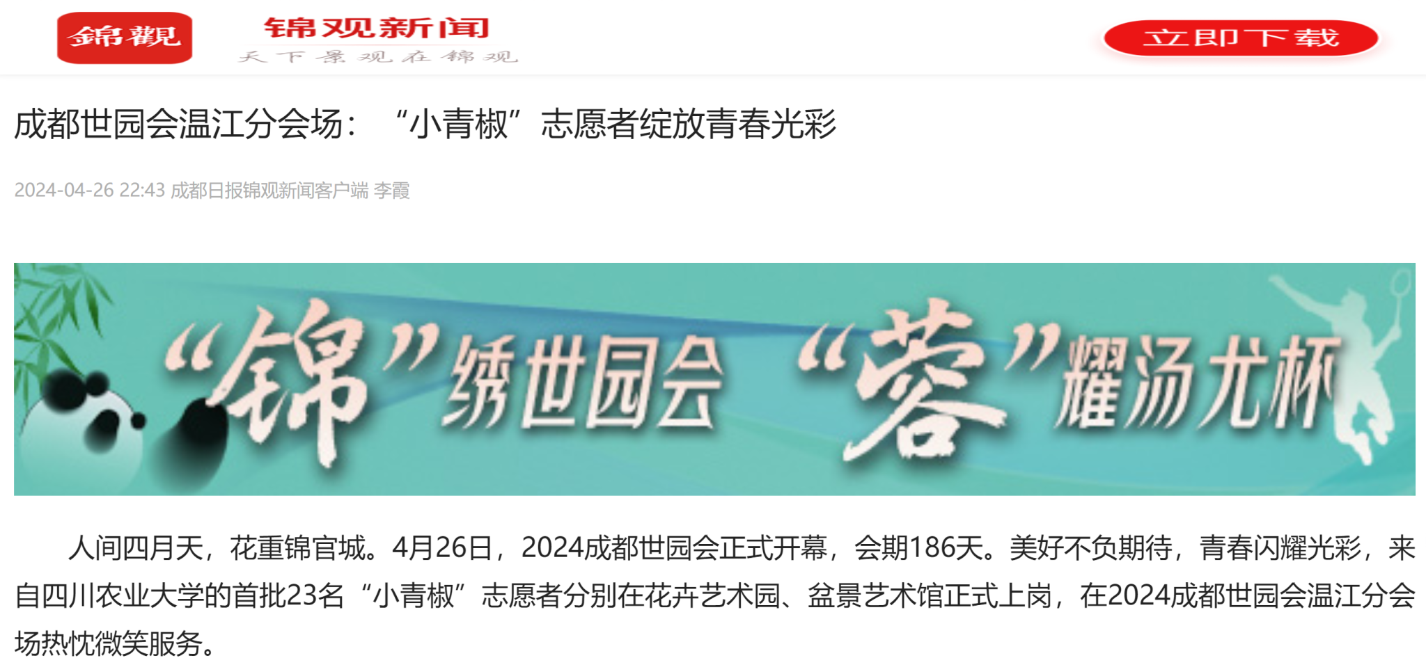 人间四月天,花重锦官城。426日,2024成都世园会正式开幕,会期186天。美好不负期待,青春闪耀光彩,来自四川农业大学的首批23名“小青椒”志愿者分别在花卉艺术园、盆景艺术馆正式上岗,在2024成都世园会温江分会场热忱微笑服务。
