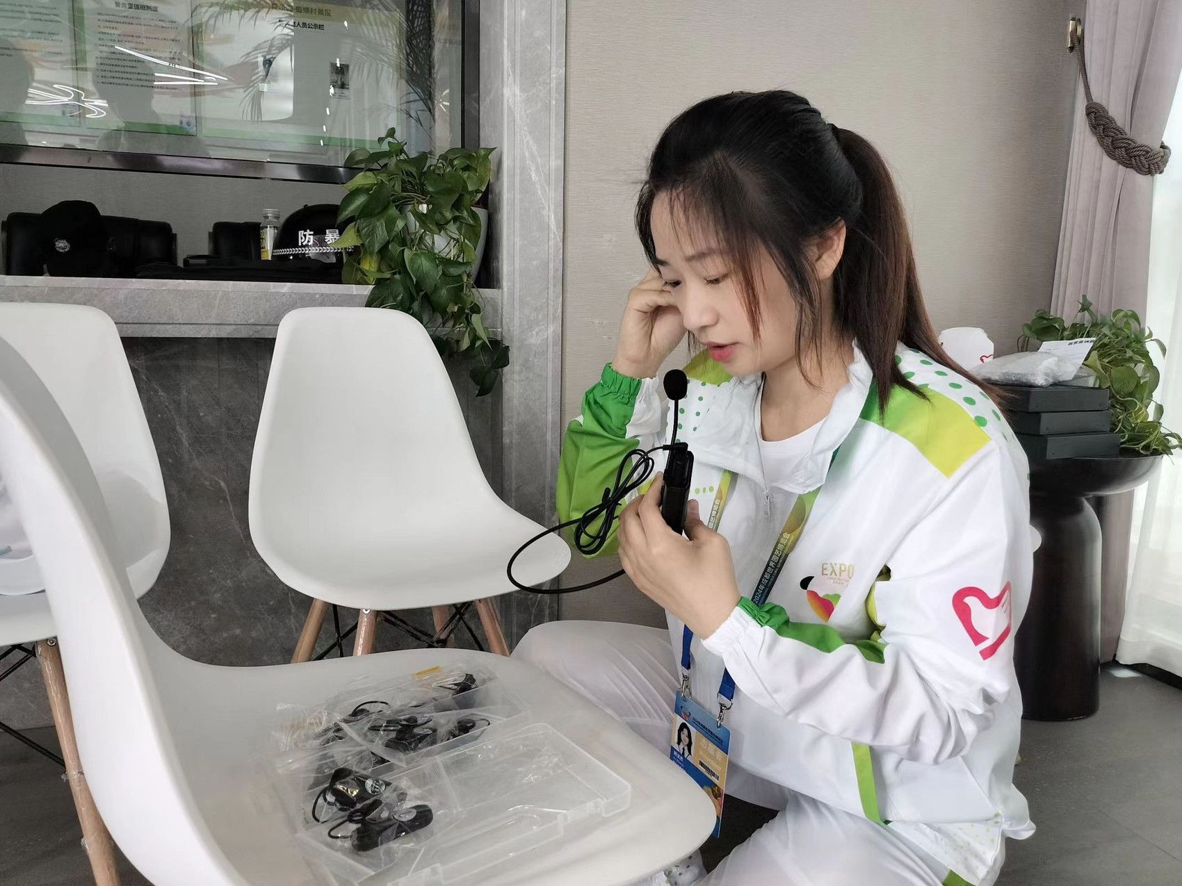 志愿者胡沈杰正在检查翻译设备。(受访者供图)