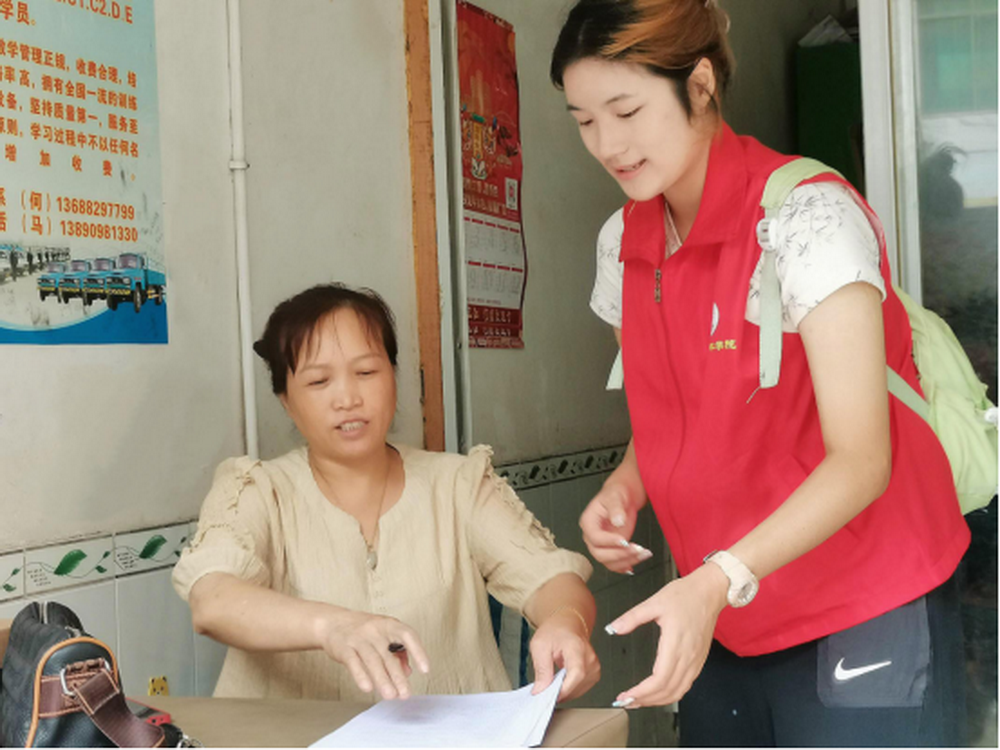 (图为团队成员与当地居民沟通填写问卷 通讯员 陈柯燚 供图)