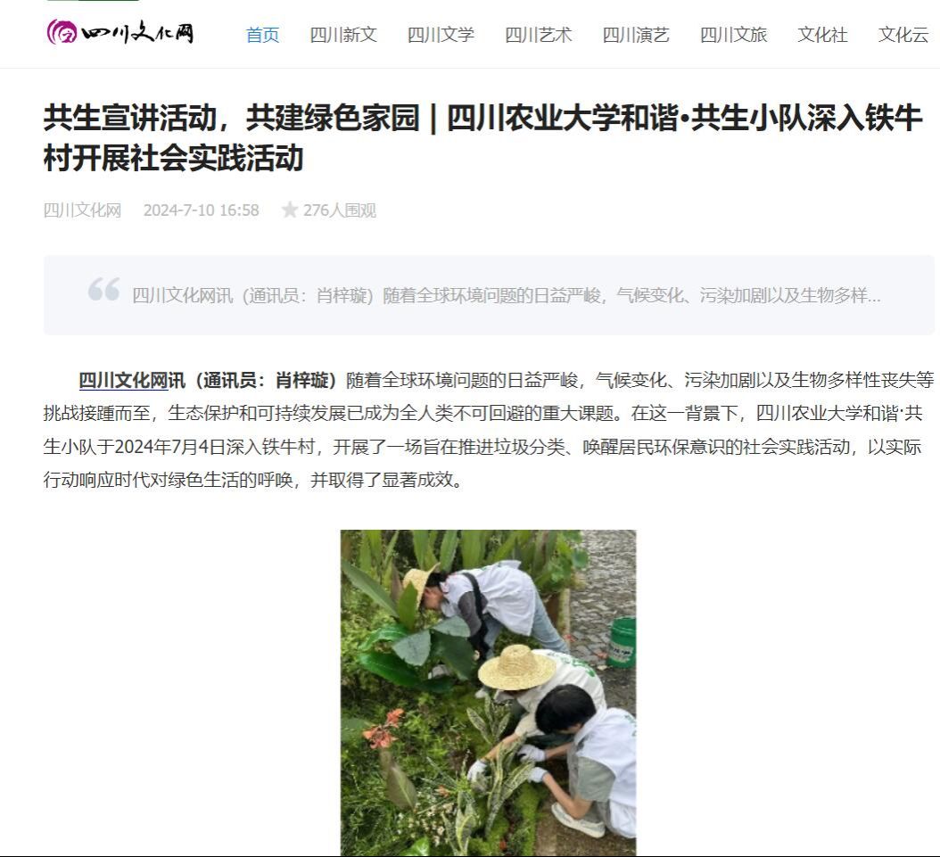 四川文化网讯(通讯员:肖梓璇)随着全球环境问题的日益严峻,气候变化、污染加剧以及生物多样性丧失等挑战接踵而至,生态保护和可持续发展已成为全人类不可回避的重大课题。在这一背景下,四川农业大学和谐·共生小队于2024年7月4日深入铁牛村,开展了一场旨在推进垃圾分类、唤醒居民环保意识的社会实践活动,以实际行动响应时代对绿色生活的呼唤,并取得了显著成效。
