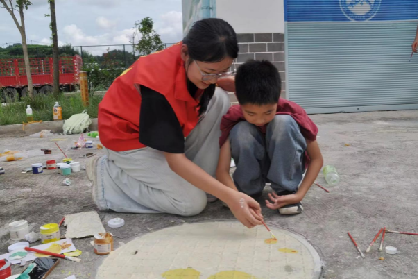 图为团队成员与夏令营同学共同在井盖上作画通讯员陈柯燚提供