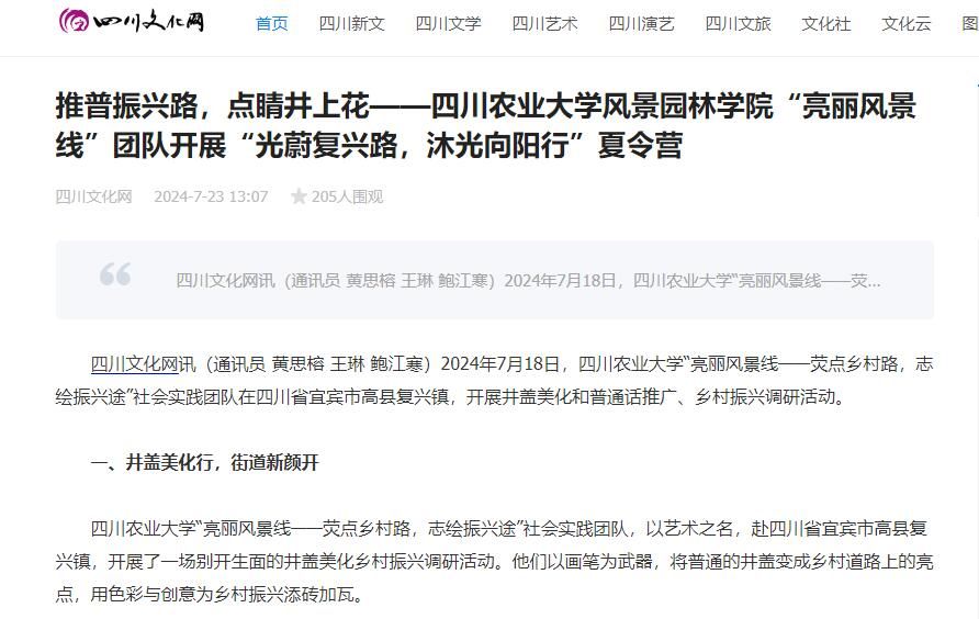 四川文化网讯(通讯员 黄思榕 王琳 鲍江寒)2024年7月18日,四川农业大学“亮丽风景线——荧点乡村路,志绘振兴途”社会实践团队在四川省宜宾市高县复兴镇,开展井盖美化和普通话推广、乡村振兴调研活动。