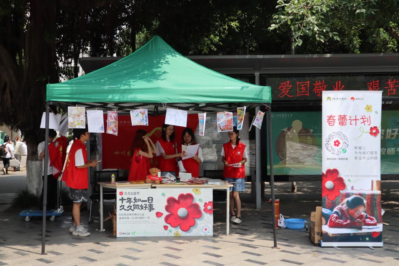 此次活动在四川农业大学成都校区食堂外的小广场举行,从9月5日至9月9日连续五天进行设点。在“久久公益节”的五天设点期间,不少同学和老师前来了解“春蕾计划”。志愿者们详细讲解了“春蕾计划”的背景和意义,激发了大家的爱心。
